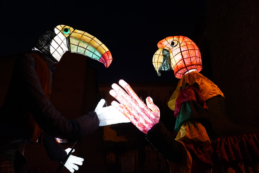 Playful creatures weave light dances and graceful gestures as they stroll through the streets. They appear suddenly, sparking curiosity, inspiring smiles, and spreading good cheer wherever they go. With their luminous costumes and poetic movements, they create a suspended moment where grace, joy, and the magic of the moment blend together.
