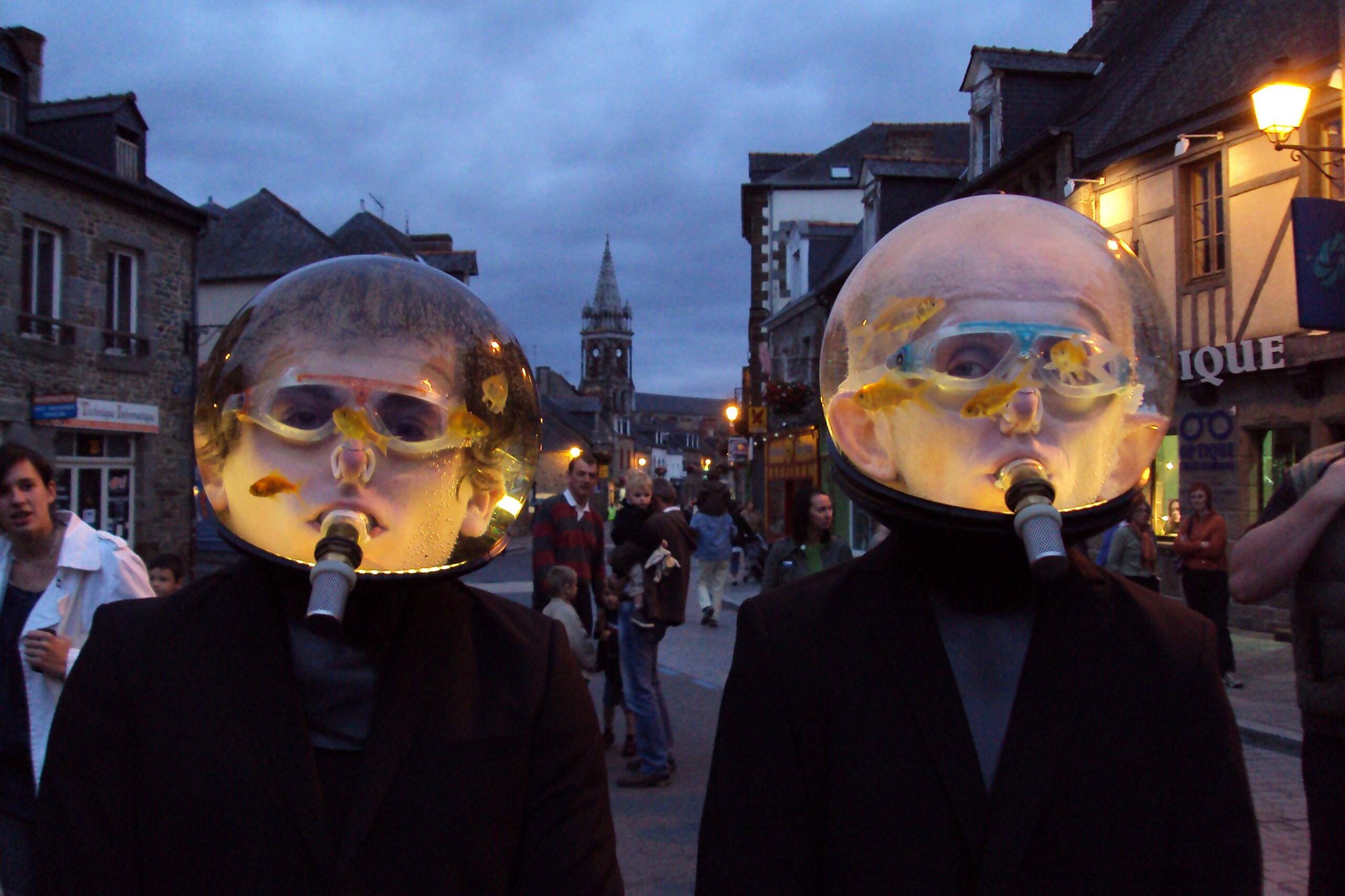 Isolated from the world, their minds elsewhere… An absurd, poetic, and bewildering image: two men with their heads trapped in a fishbowl where goldfish swim. What would your ability to connect with others be if barriers stood in your way?